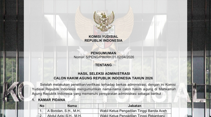 Jakarta – Komisi Yudisial Republik Indonesia (KY) resmi mengumumkan hasil seleksi administrasi Calon Hakim Agung (CHA) tahun 2026.